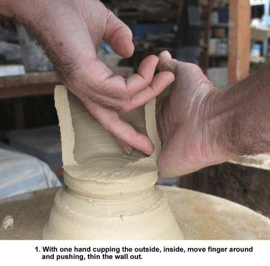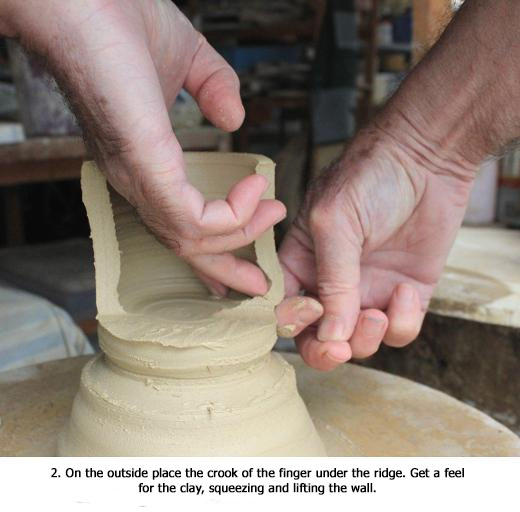 After opening up the hump, inside at the base, the fingers push out on the wall a little, or wiggle around a bit on the wall. At the same time the other hand or fingers are restraining the wall on the outside. This pressure from inside makes a slight ridge in the wall. Right from the start, thin it out as thin as you want the wall to be in the end product, at least as thin as you can. Then with the outside fingers under the ridge, applying a squeeze between the inner and the outer, the ridge can be felt to be running over the fingers. With the rotation of the wheel, there will be a natural rise of the clay over the fingers and up the wall. At first it is best not to try to do anything fully all at once. So you can just go up a short section, and repeat it. Then do a bit more further up, or go back to the base again, and so on, squeezing and rising, rather than “lifting”.